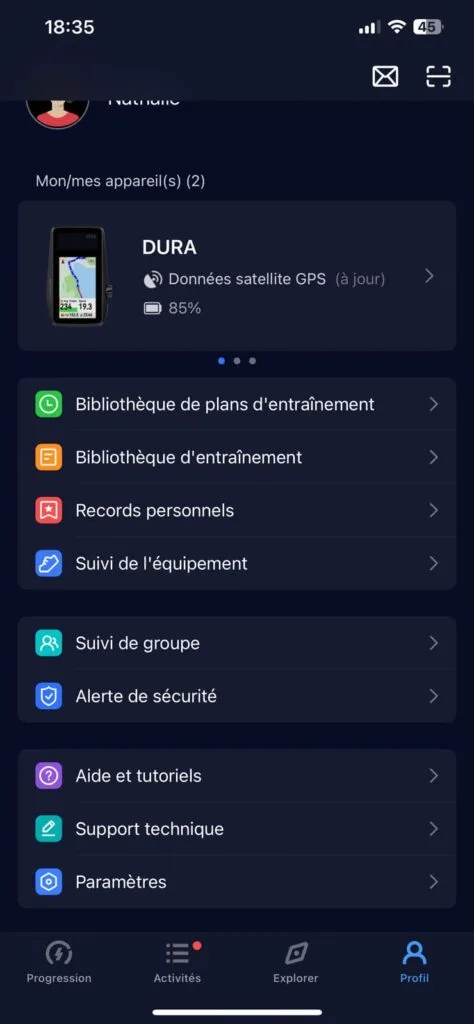 L’appairage du Coros Dura avec son application se fait simplement via un QR Code au premier démarrage. Une fois connecté, le compteur se synchronise automatiquement, permettant d’accéder aux activités, aux parcours et aux séances programmées, ainsi qu’à de nombreux autres paramètres.