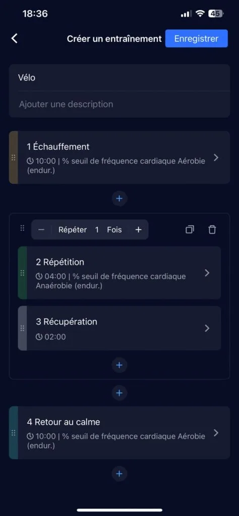 L’application Coros permet de créer des plans d’entraînement personnalisés, de synchroniser des parcours et des séances spécifiques, ainsi que de personnaliser les profils d’activité. Comme pour les itinéraires, les séances peuvent être créées directement dans l’application, importées depuis des plateformes tierces telles que TrainingPeaks ou via un fichier.
